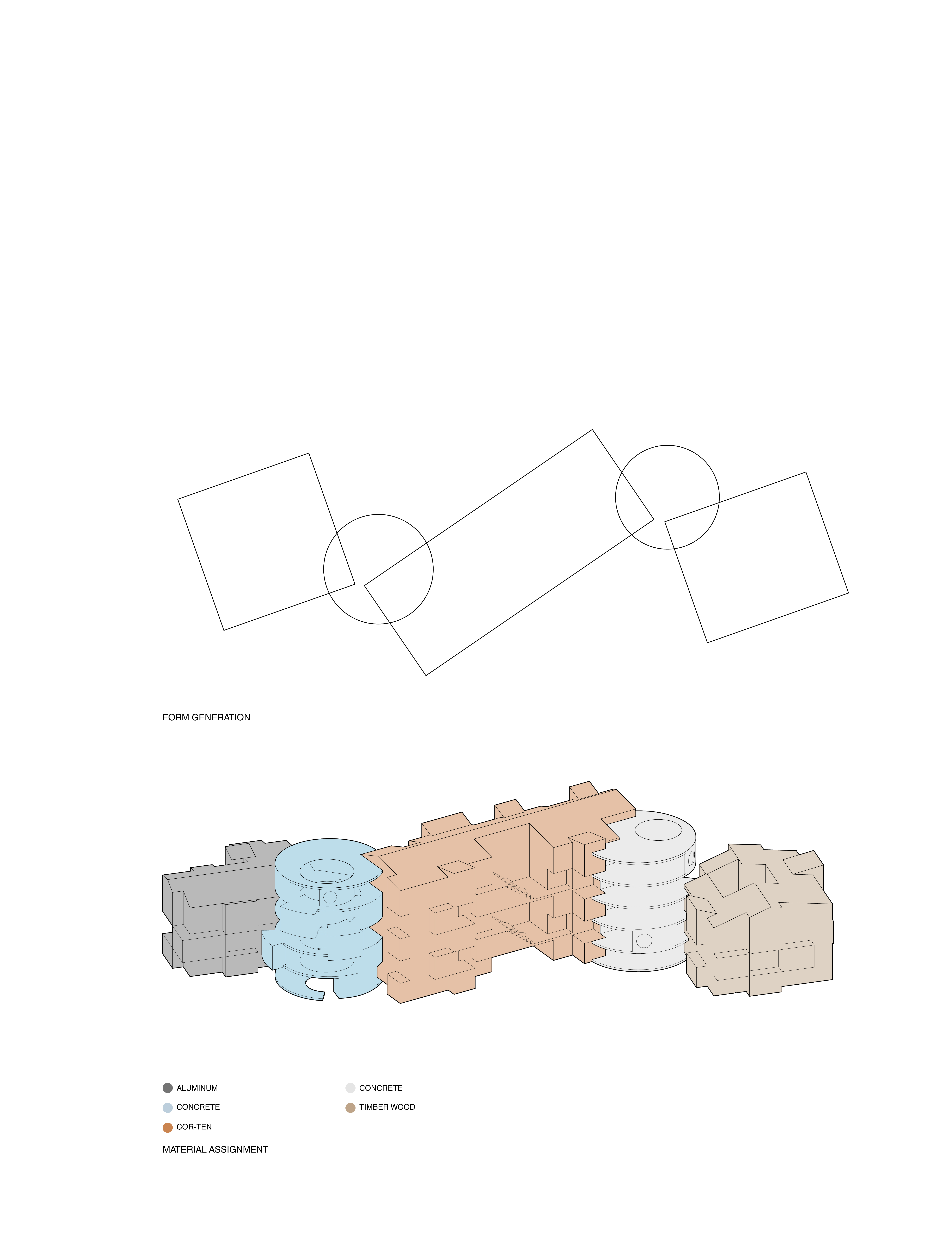 Our form is generated by 5 simple geometry: two circles, two squares and one rectangle. The square and rectangle are rotated on two circular nodes. Our aim was to combine these geometry to create a playful sculptural shape.